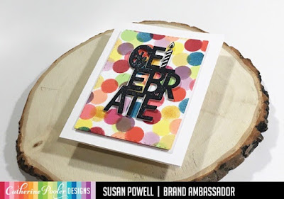 After I added all the dots/balloons to a piece of white card stock I die cut it with the large stitched rectangle from the Postage Stamp Dies. I added that piece to a white card base with craft foam for dimension. Next I die cut the Celebrate Die from black card stock and craft foam and then added it to the balloons.