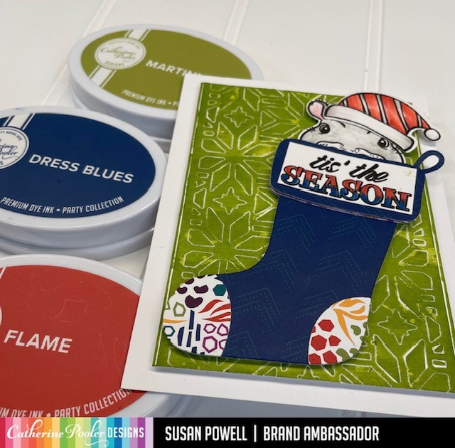 I knew I wanted the hippo to be coming out of a stocking for a Christmas card so I also used the following Catherine Pooler Designs products: