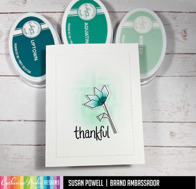 I colored it with Minted, Aquatini and Uptown inks using a blender pen. I cut it and a piece of craft foam with the coordinating die and adhered them together with some Bearly Arts Glue and then adhered that to the card.