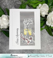 I cut a piece of white card stock using the large stitched rectangle from the Postage Stamp Die Set. I had a strip of b&w striped paper from MFT on my desk and I cut that with the same die only cutting the top and bottom edges. I adhered them together then adhered them to a white card base. I stamped the sentiment on the side then adhered the champagne glasses. It's hard to see in the pics but I used a glitter pen to add some sparkle to the champagne.