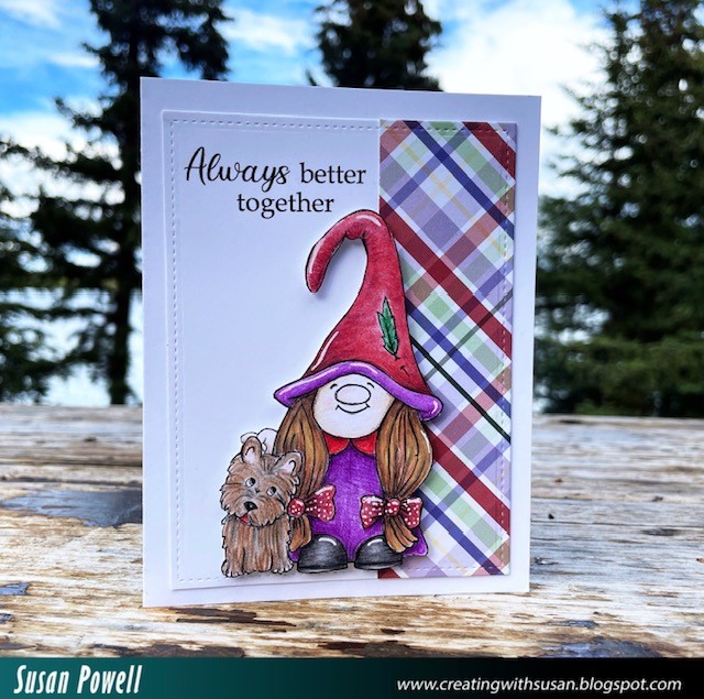 Today I'm sharing a card I made using the adorable Fido & Friend Digi image from KLM Digital Designs. I printed the image onto white card stock and colored it in using my Prismacolor Pencils. I knew I wanted some patterned paper behind the image so I chose that first then chose my pencils using the colors in the paper.